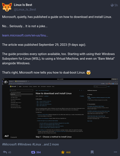 Timely_Jellyfish_2077@programming.dev to Linux@lemmy.mlEnglish · 3 years agoMicrosoft published a guide on how to install Linux.programming.devimagemessage-square6linkfedilinkarrow-up18arrow-down11