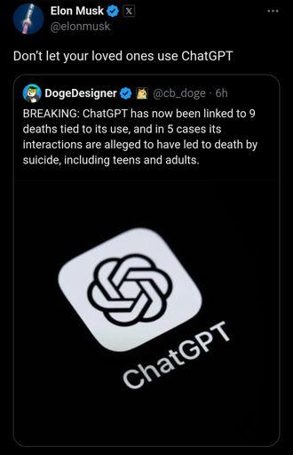 arrow-up1117arrow-down1imageElon Musk and Sam Altman clashed on X after Musk shared a post about a man who committed a murder-suicide following delusional conversations with ChatGPTlemmus.orgBeep@lemmus.org to Technology@beehaw.orgEnglish · 1 day agomessage-square20linkfedilinkfile-text