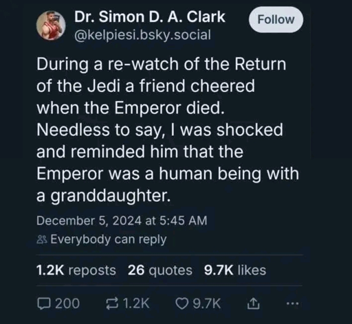 [alt text: a text post by @kelpiesi.bsky.social on Bluesky. The text says: “During a re-watch of the Return of the Jedi a friend cheered when the Emperor died. Needless to say, I was shocked and reminded him that the Emperor was a human being with a granddaughter.”]