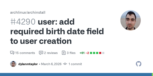 Recent age verification laws in California (AB-1043), Colorado (SB26-051), Brazil (Lei 15.211/2025), etc. require platforms to verify user age. Collecting birth date at install time ensures Arch Linux is compliant with these regulations.