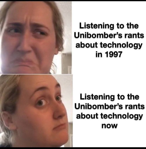 FoxtrotDeltaTango@sh.itjust.works to Programmer Humor@programming.dev · 1 day agoThe unAbomber. Otherwise, I agree.lemmy.worldimagemessage-square3linkfedilinkarrow-up1212arrow-down113file-text