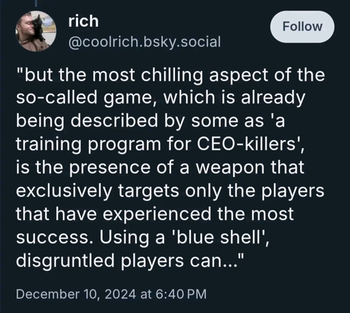 [alt text: a text post by @coolrich.bsky.social. The text is entirely in quotation marks, as if it is being quoted from an article, and it says: “but the most chilling aspect of the so-called game, which is already being described by some as ‘a training program for CEO-killers’, is the presence of a weapon that exclusively targets only the players that have experienced the most success. Using a ‘blue shell’, disgruntled players can…”(dot dot dot)]