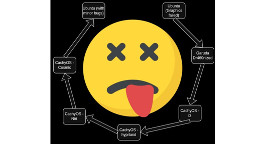 Niri: Installation worked, but I don’t like that the task bar on top can’t be interacted with the mouse. I don’t know if it’s a bug, but it annoyed me. Pressing the Super Key did nothing, I expected to be able to select an app to launch. Frustrating. - Reinstalled again