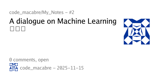 TheracAriane@thebrainbin.org to Machine Learning@lemmy.ml · 2 months agoA dialogue on Machine Learning 🤓🤓🤓plus-squarecodeberg.orgexternal-linkmessage-square0linkfedilinkarrow-up11arrow-down10