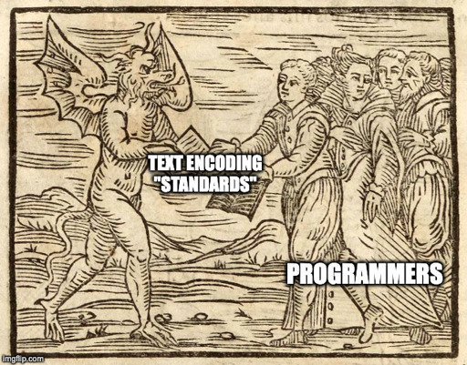0·1 year agoText encoding ‘standards’ were clearly the devil’s work, handed down to humanity to sow chaos and suffering.